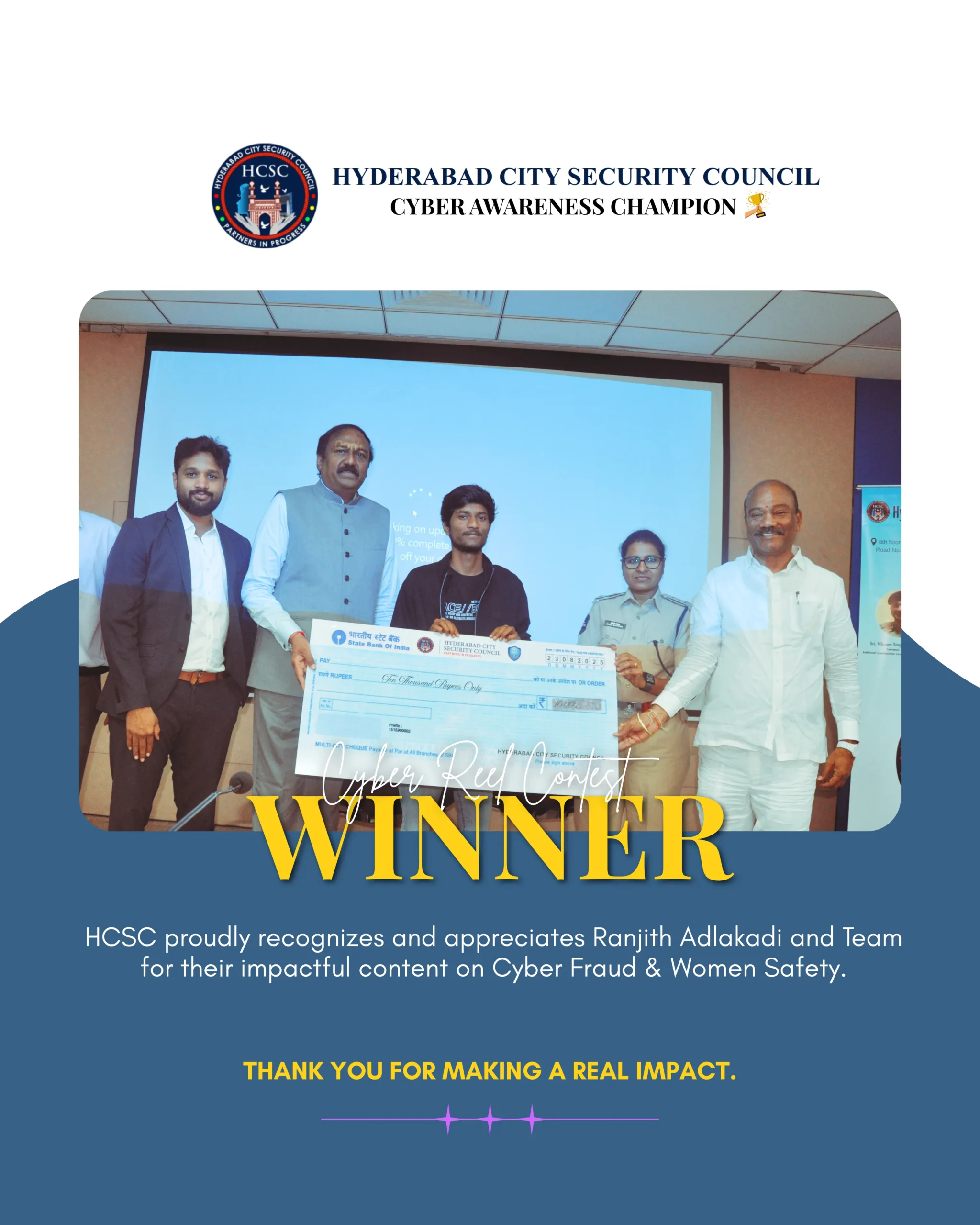 Won the prestigious Cyber Awareness Program Contest by Hyderabad City Security Counsil (HCSC) for impactful content on Cyber Fraud & Women Safety.